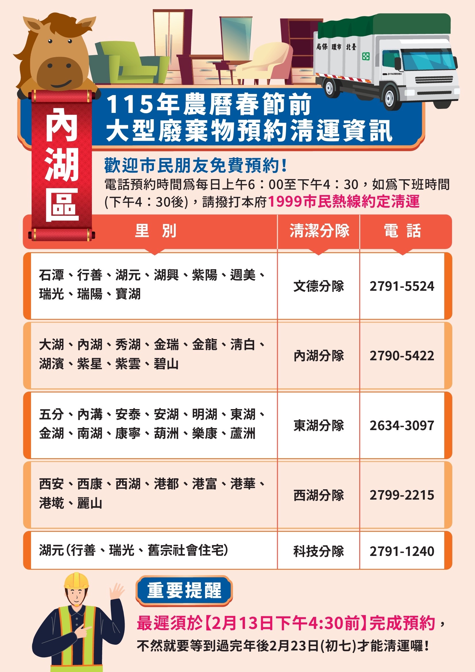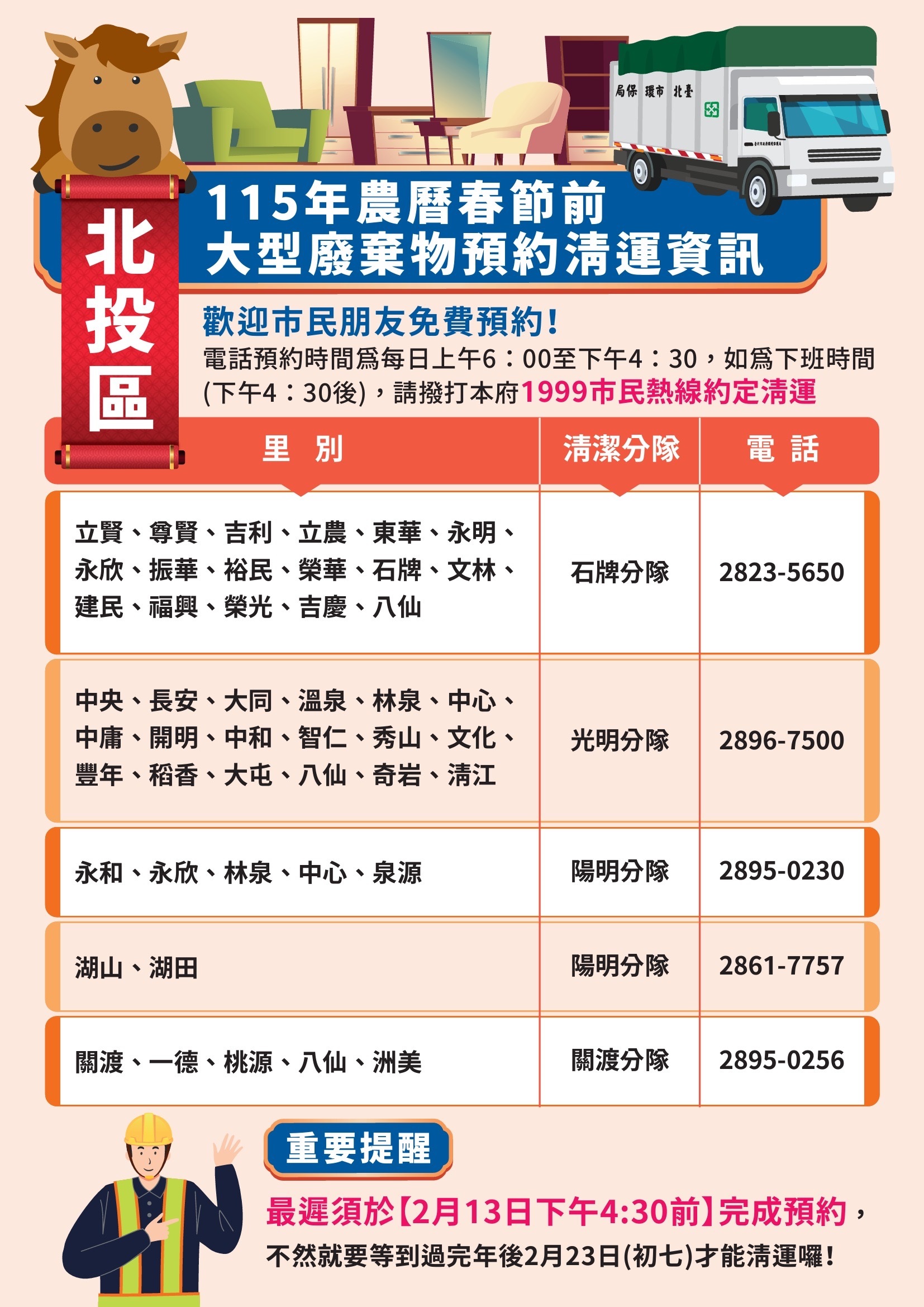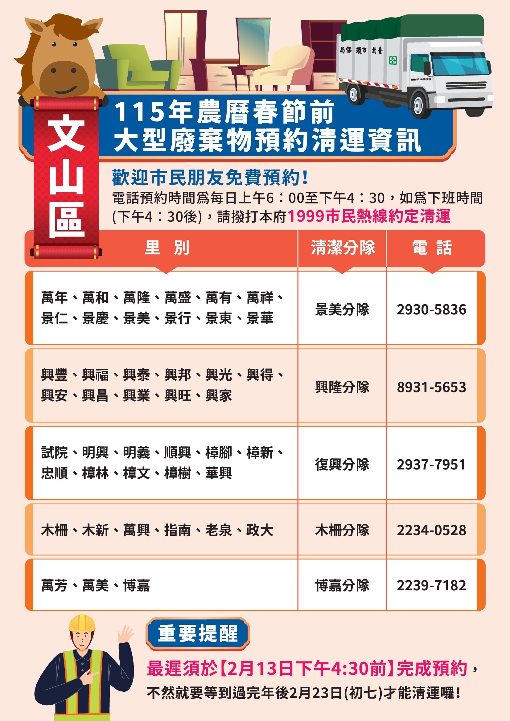校園公告 公告主旨 本市115年年終大掃除暨春節期間垃圾清運方式 發佈日期 2026 年 1 月 20 日 發佈單位 衛生組 公告類別 行政公告 公告等級 公告 點閱次數 63 公告內容 詳如附件 相關附件 1150115函宣傳 1150115函宣傳 檔案名稱檔案大小檔案格式下載1150115函宣傳.pdf263.87 KB新視窗開啟檔案 1150115函宣傳.pdf 1150115函海報 1150115函海報 檔案名稱檔案大小檔案格式下載1150115函海報.pdf4.26 MB新視窗開啟檔案 1150115函海報.pdf 士林區 士林區 檔案名稱檔案大小檔案格式下載士林區.jpg852.28 KB新視窗開啟檔案 士林區.jpg 大同區 大同區 檔案名稱檔案大小檔案格式下載大同區.jpg743.82 KB新視窗開啟檔案 大同區.jpg 大安區 大安區 檔案名稱檔案大小檔案格式下載大安區.jpg821.56 KB新視窗開啟檔案 大安區.jpg 中山區 中山區 檔案名稱檔案大小檔案格式下載中山區.jpg782.21 KB新視窗開啟檔案 中山區.jpg 中正區 中正區 檔案名稱檔案大小檔案格式下載中正區.jpg733.03 KB新視窗開啟檔案 中正區.jpg 內湖區 內湖區 檔案名稱檔案大小檔案格式下載內湖區.jpg761.85 KB新視窗開啟檔案 內湖區.jpg 文山區 文山區 檔案名稱檔案大小檔案格式下載文山區.jpg753.92 KB新視窗開啟檔案 文山區.jpg 北投區 北投區 檔案名稱檔案大小檔案格式下載北投區.jpg755.13 KB新視窗開啟檔案 北投區.jpg 松山區 松山區 檔案名稱檔案大小檔案格式下載松山區.jpg695.16 KB新視窗開啟檔案 松山區.jpg 信義區 信義區 檔案名稱檔案大小檔案格式下載信義區.jpg742.84 KB新視窗開啟檔案 信義區.jpg 南港區 南港區 檔案名稱檔案大小檔案格式下載南港區.jpg628.58 KB新視窗開啟檔案 南港區.jpg 萬華區 萬華區 檔案名稱檔案大小檔案格式下載萬華區.jpg771.90 KB新視窗開啟檔案 萬華區.jpg 【2026-01-20】寒假期間持續落實登革熱/屈公病等蚊媒傳染病之防疫措施宣導 【2026-01-20】財團法人台北市衛理校友教育基金會
