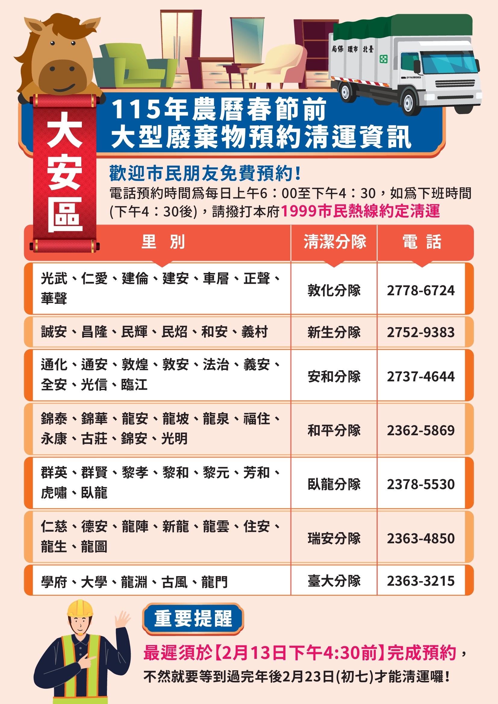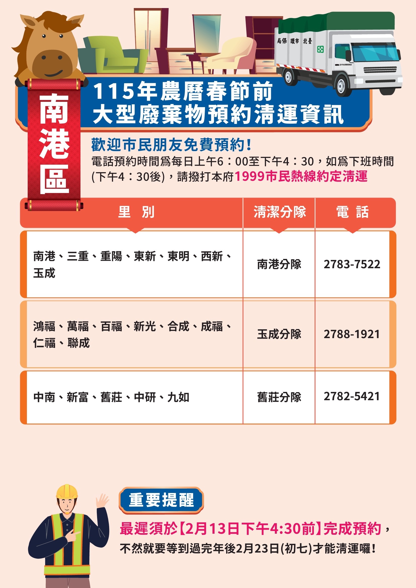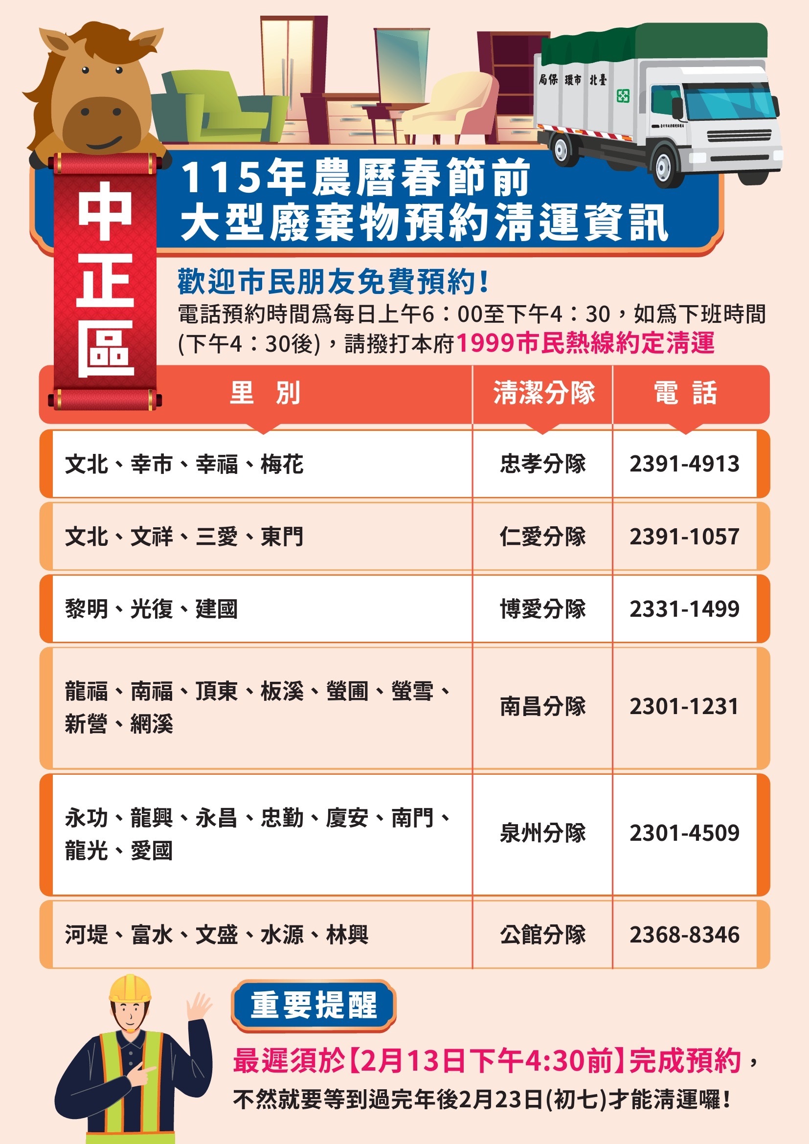 校園公告 公告主旨 本市115年年終大掃除暨春節期間垃圾清運方式 發佈日期 2026 年 1 月 20 日 發佈單位 衛生組 公告類別 行政公告 公告等級 公告 點閱次數 63 公告內容 詳如附件 相關附件 1150115函宣傳 1150115函宣傳 檔案名稱檔案大小檔案格式下載1150115函宣傳.pdf263.87 KB新視窗開啟檔案 1150115函宣傳.pdf 1150115函海報 1150115函海報 檔案名稱檔案大小檔案格式下載1150115函海報.pdf4.26 MB新視窗開啟檔案 1150115函海報.pdf 士林區 士林區 檔案名稱檔案大小檔案格式下載士林區.jpg852.28 KB新視窗開啟檔案 士林區.jpg 大同區 大同區 檔案名稱檔案大小檔案格式下載大同區.jpg743.82 KB新視窗開啟檔案 大同區.jpg 大安區 大安區 檔案名稱檔案大小檔案格式下載大安區.jpg821.56 KB新視窗開啟檔案 大安區.jpg 中山區 中山區 檔案名稱檔案大小檔案格式下載中山區.jpg782.21 KB新視窗開啟檔案 中山區.jpg 中正區 中正區 檔案名稱檔案大小檔案格式下載中正區.jpg733.03 KB新視窗開啟檔案 中正區.jpg 內湖區 內湖區 檔案名稱檔案大小檔案格式下載內湖區.jpg761.85 KB新視窗開啟檔案 內湖區.jpg 文山區 文山區 檔案名稱檔案大小檔案格式下載文山區.jpg753.92 KB新視窗開啟檔案 文山區.jpg 北投區 北投區 檔案名稱檔案大小檔案格式下載北投區.jpg755.13 KB新視窗開啟檔案 北投區.jpg 松山區 松山區 檔案名稱檔案大小檔案格式下載松山區.jpg695.16 KB新視窗開啟檔案 松山區.jpg 信義區 信義區 檔案名稱檔案大小檔案格式下載信義區.jpg742.84 KB新視窗開啟檔案 信義區.jpg 南港區 南港區 檔案名稱檔案大小檔案格式下載南港區.jpg628.58 KB新視窗開啟檔案 南港區.jpg 萬華區 萬華區 檔案名稱檔案大小檔案格式下載萬華區.jpg771.90 KB新視窗開啟檔案 萬華區.jpg 【2026-01-20】寒假期間持續落實登革熱/屈公病等蚊媒傳染病之防疫措施宣導 【2026-01-20】財團法人台北市衛理校友教育基金會
