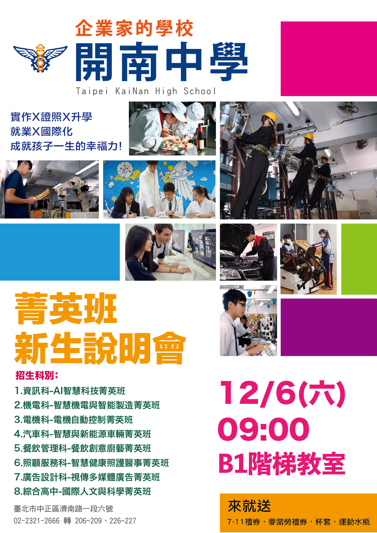 校園公告 公告主旨 【技藝宣導】開南中學辦理「114學年度第一學期菁英班新生家長說明會」 發佈日期 2025 年 11 月 24 日 發佈單位 輔導室 公告類別 升學資訊 公告等級 無 點閱次數 14 公告內容 相關附件 開南中學辦理「114學年度第一學期菁英班新生家長說明會」函 開南中學辦理「114學年度第一學期菁英班新生家長說明會」函 檔案名稱檔案大小檔案格式下載開南中學辦理「114學年度第一學期菁英班新生家長說明會」函.pdf401.64 KB新視窗開啟檔案開南中學114學年度第一學期菁英班新生家長說明會-海報.jpg1.20 MB新視窗開啟檔案 開南中學辦理「114學年度第一學期菁英班新生家長說明會」函.pdf開南中學114學年度第一學期菁英班新生家長說明會-海報.jpg 【2025-11-25】2025年國際身心障礙者日「心聲—新生」徵文活動獲獎者之故事授權 ... 【2025-11-24】114年度資訊融入教學教師研習計畫