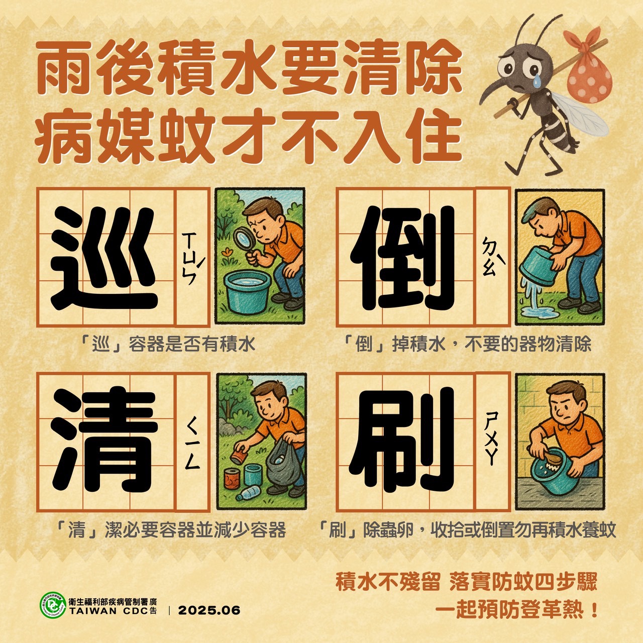 校園公告 公告主旨 疾管署「雨後巡倒清刷」之衛教宣導 發佈日期 2025 年 8 月 01 日 發佈單位 衛生組 公告類別 行政公告 公告等級 公告 點閱次數 185 公告內容 詳如附件 相關附件 1140731函衛教宣導 1140731函衛教宣導 檔案名稱檔案大小檔案格式下載1140731函衛教宣導.pdf363.29 KB新視窗開啟檔案 1140731函衛教宣導.pdf 1140731函海報 1140731函海報 檔案名稱檔案大小檔案格式下載1140731函海報.jpg624.11 KB新視窗開啟檔案 1140731函海報.jpg 1140731函海報1 1140731函海報1 檔案名稱檔案大小檔案格式下載1140731函海報1.jpg518.80 KB新視窗開啟檔案 1140731函海報1.jpg 【2025-08-01】教育部國民及學前教育署「中學全面性教育教學指引手冊」 【2025-08-01】衛生福利部食品藥物管理署114年6月4日公告修正之 「食品良好衛生 ...