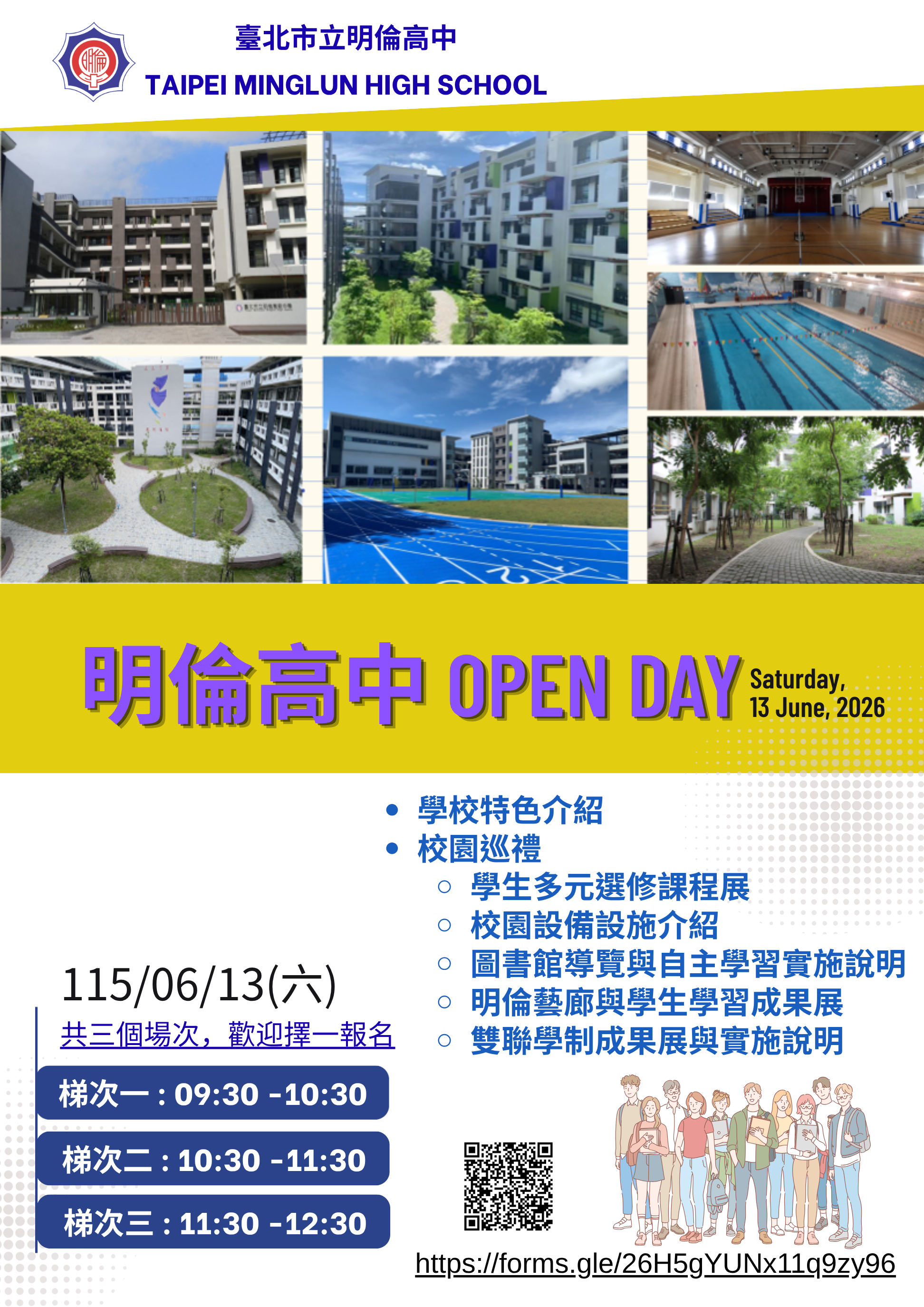 校園公告 公告主旨 115明倫高中Open Day 發佈日期 2026 年 4 月 29 日 發佈單位 輔導室 公告類別 升學資訊 公告等級 無 點閱次數 7 公告內容 相關附件 115明倫高中Open Day-海報 115明倫高中Open Day-海報 檔案名稱檔案大小檔案格式下載115明倫高中Open Day-海報.png4.37 MB新視窗開啟檔案 115明倫高中Open Day-海報.png 【2026-04-29】114-2第二次定期評量日期與範圍表 【2026-04-29】臺大生命教育研發育成中心辦理「115年度教師在職進修生命教育增 ...