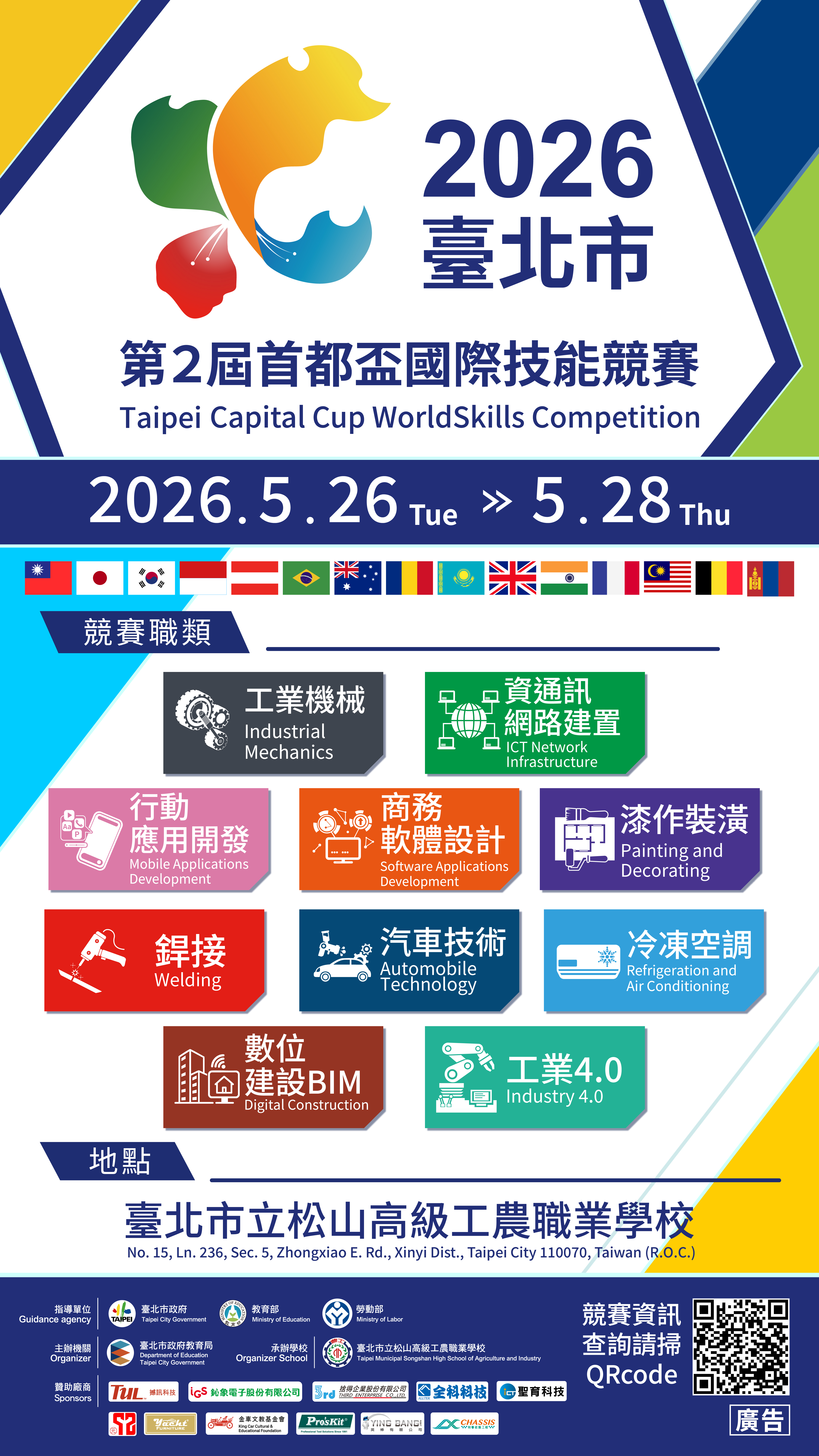 校園公告 公告主旨 2026臺北市第2屆首都盃國際技能競賽宣傳 發佈日期 2026 年 4 月 20 日 發佈單位 輔導室 公告類別 活動競賽 公告等級 無 點閱次數 30 公告內容 相關附件 2026第二屆首都盃國際技能競賽-文宣 2026第二屆首都盃國際技能競賽-文宣 檔案名稱檔案大小檔案格式下載2026第二屆首都盃國際技能競賽-文宣.jpg5.97 MB新視窗開啟檔案 2026第二屆首都盃國際技能競賽-文宣.jpg 【2026-04-21】敬邀師生參與「2026年ACT夢想家跨校發表會-PBL專 題論壇」活動, ... 【2026-04-20】「115年臺北市跨國銜轉生小小外交官暑期體驗學習營」第二階段報名